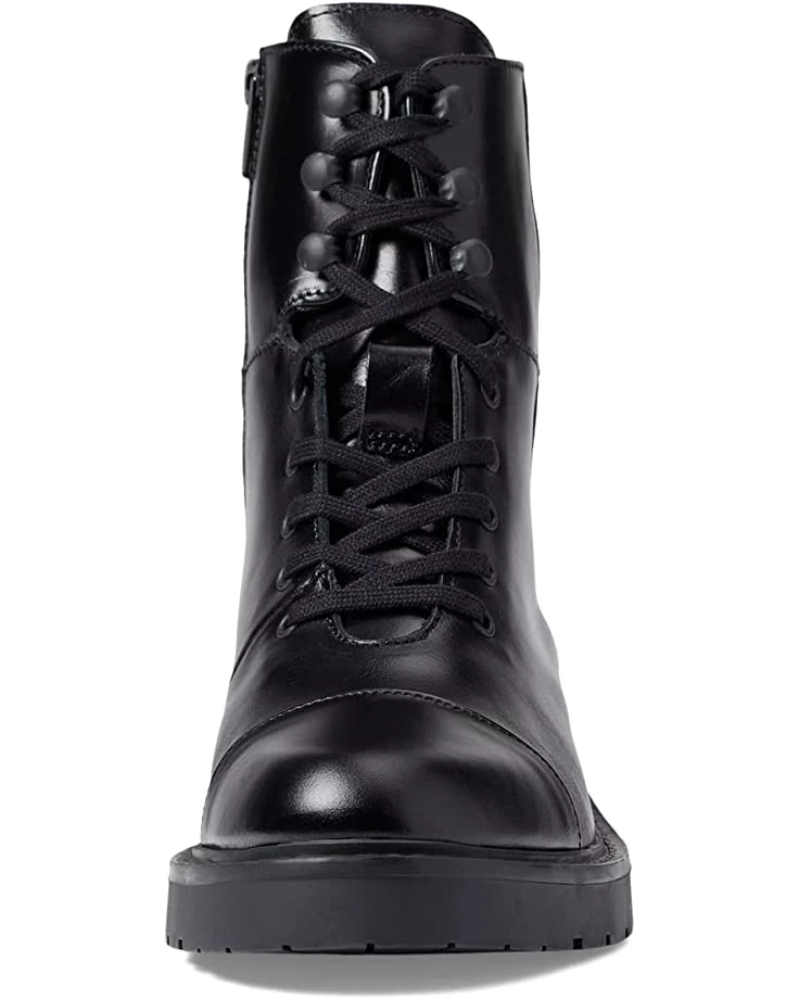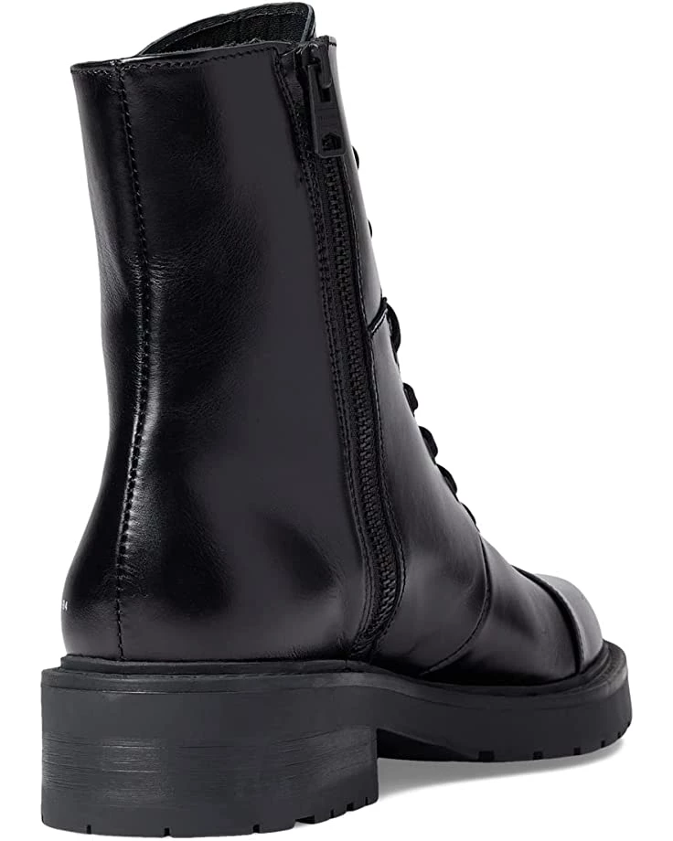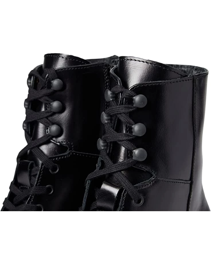 - Military shoe-inspired lace-up panel with zippered side closure.