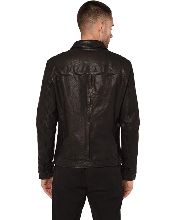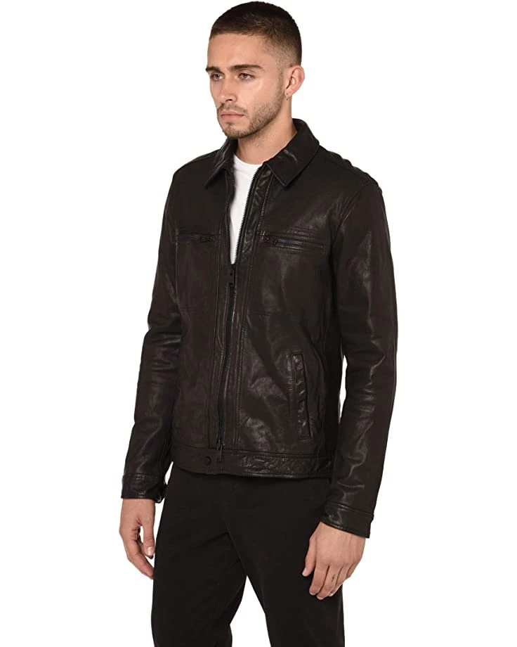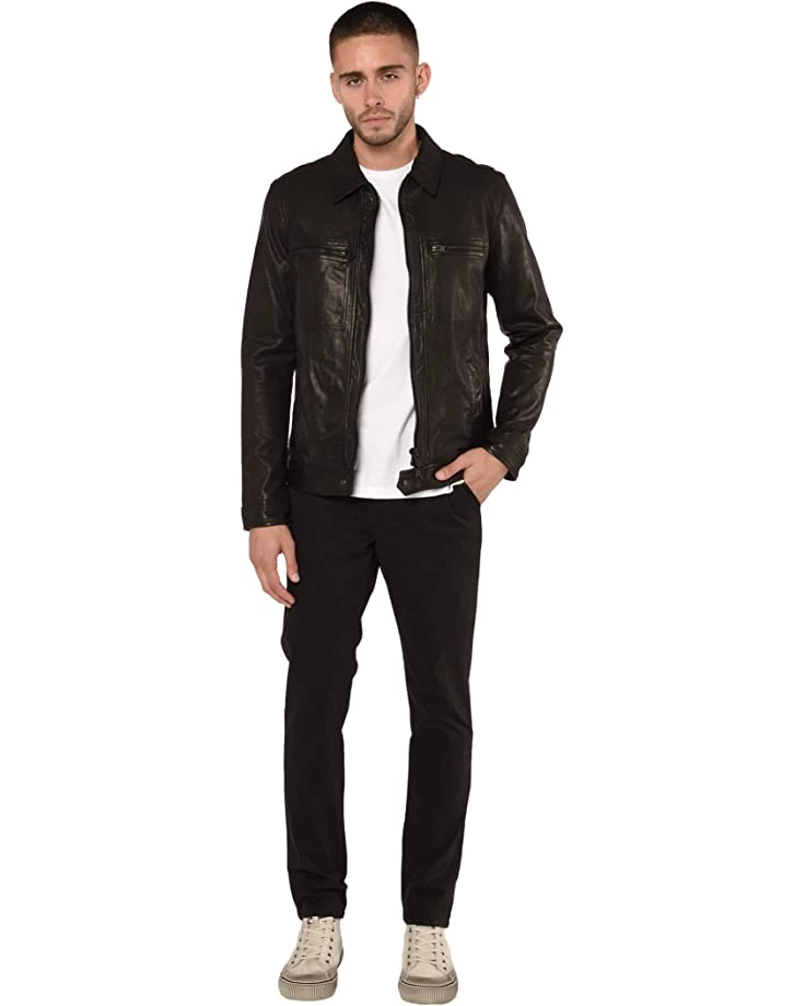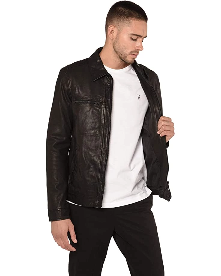 - The AllSaintsβ’ Lark Leather Jacket is a favorite, more minimalist style in a regular fit. Featuring a point collar, two horizontal zip chest pockets and a snap fastening waistband tab.