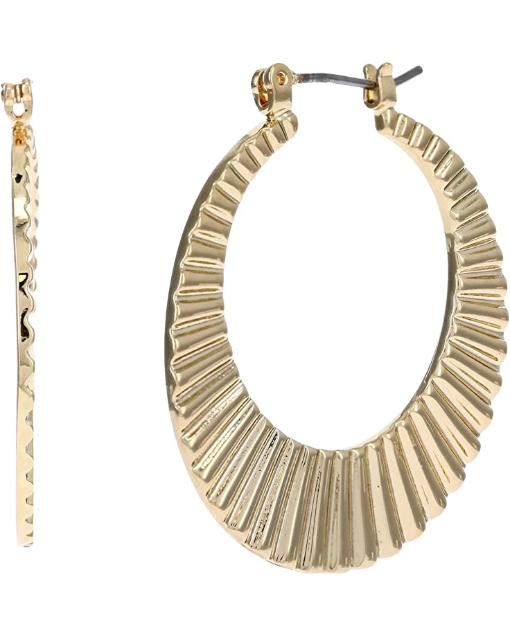- Striking textured fan sculptural hoop earrings with a click-top closure. made from polished gold-tone brass metal.