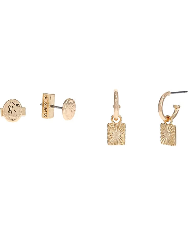 - Complete any look by accessorizing with the AllSaintsβ’ Textured Stud Huggie Earrings Set featuring textured round studs and sleek huggie adorned with a dangling fan charm.